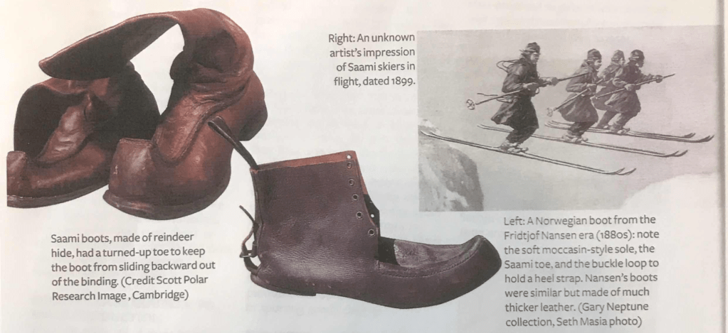 A 2006 article from Skiing History described early boots with the same word. DiSante had used an Algonquin word – moccasin – to describe a Sámi technology. The more recent author chose to simultaneously reference the Sámi from northern Scandinavian and Native Americans from Turtle Island (North America), to describe an early boot. Under an image, the caption read, “note the soft moccasin-style sole, the Saami toe, and the buckle loop to hold the heel strap.” Moccasin this time was highly specific. It referred specifically to the sole of the boot. The boot tips, in turn, was referred to as “Sámi.” Neither, in this example, require adjectives connoting Indigenous groups. Rather, the two words convey something more than boot material and design. The words in this context are meant to connote the idea that early ski technology was primitive.